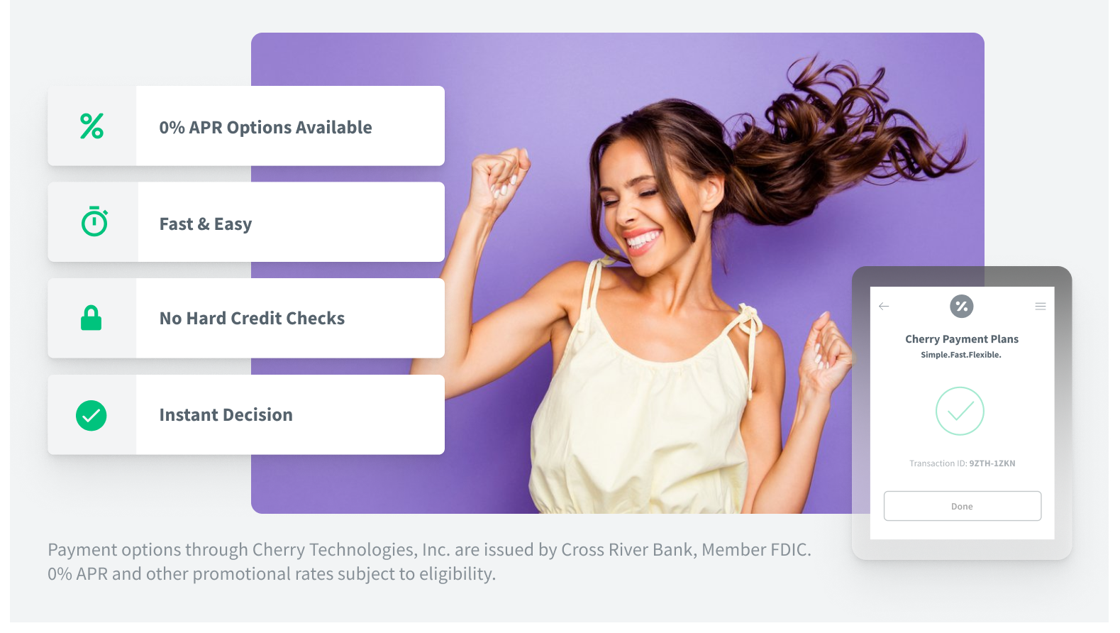 Payment options through Cherry Technologies, Inc. are issued by the following lending partners: https://withcherry.com/lending-partners/.